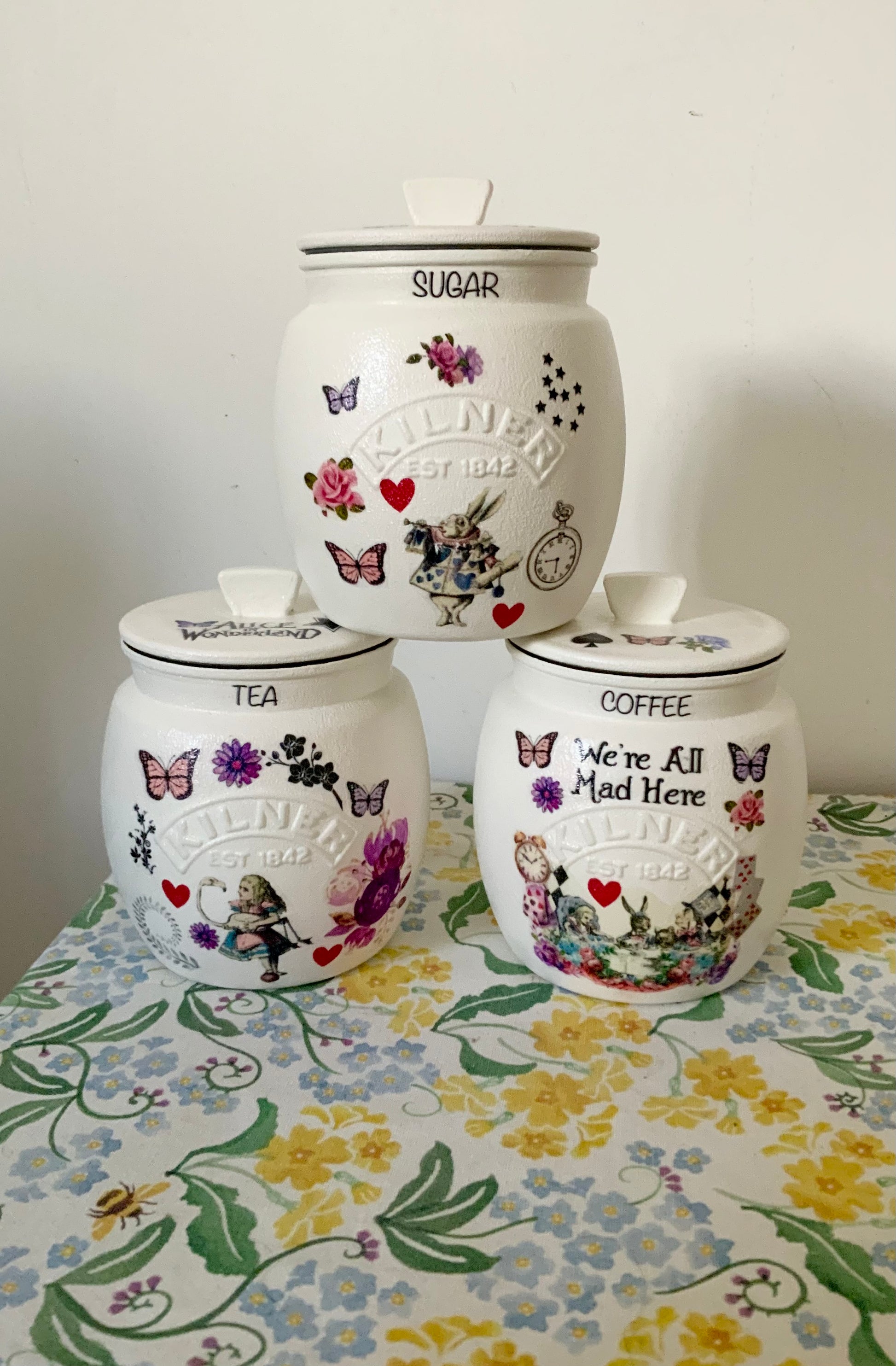 Alice In Wonderland Mad Hatters Tea Coffee Sugar Kilner jar set