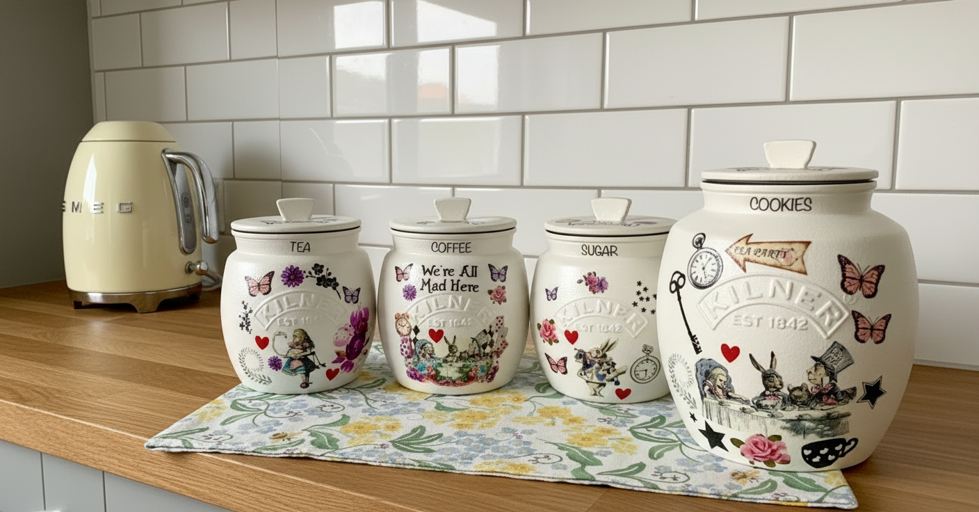 Alice In Wonderland Mad Hatters Tea Coffee Sugar Kilner and matching cookie Jar set
