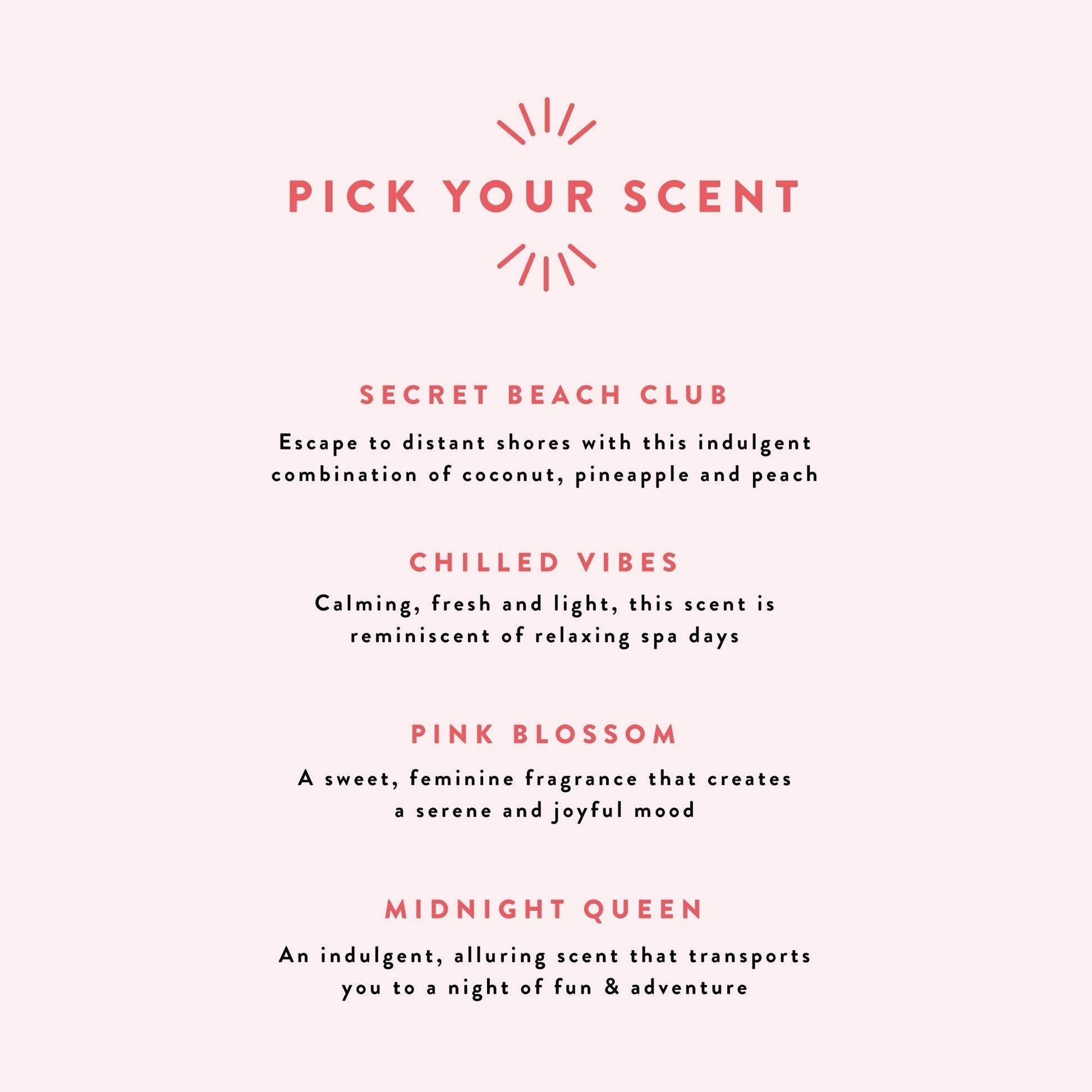 Calming, fresh and light, this scent is reminiscent of relaxing spa days. Chilled Vibes perfectly balances fresh citrus with eucalyptus on a calming floral base.