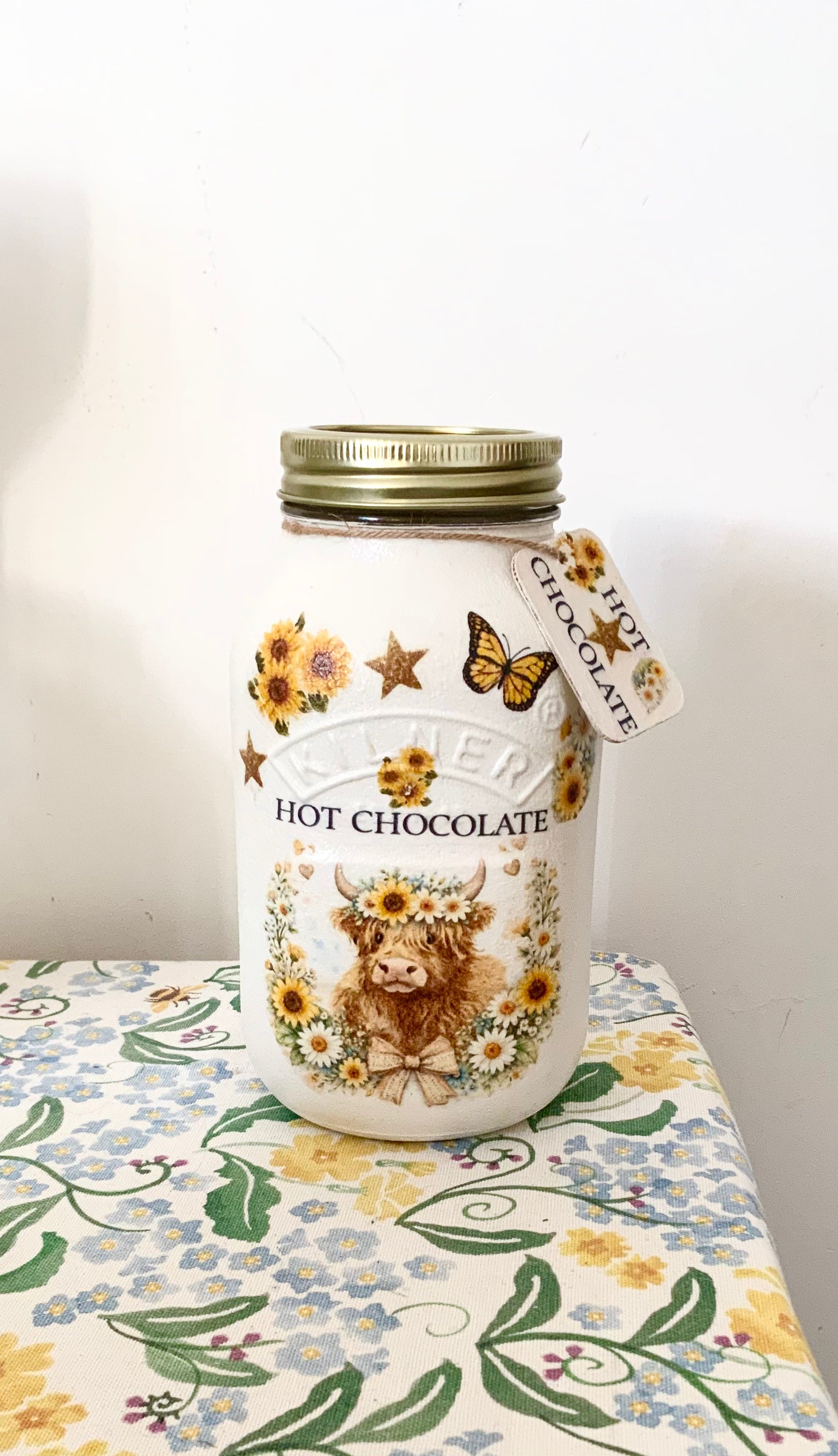 Highland cow vintage inspired floral sunflower and daisys kilner hot chocolate jar